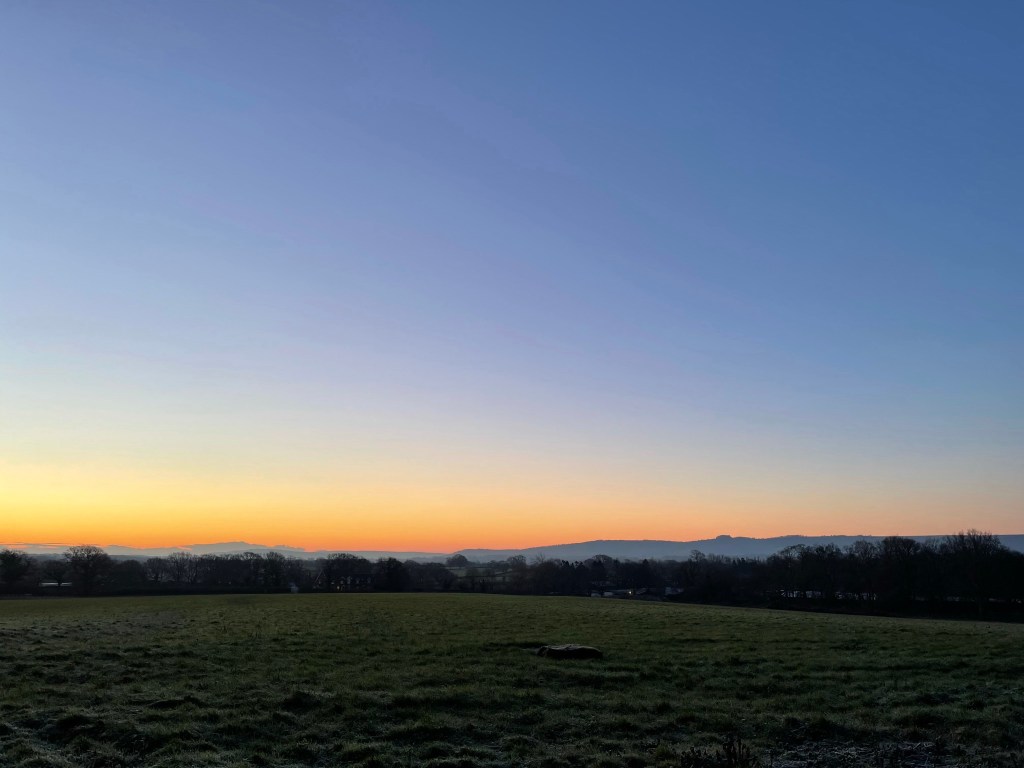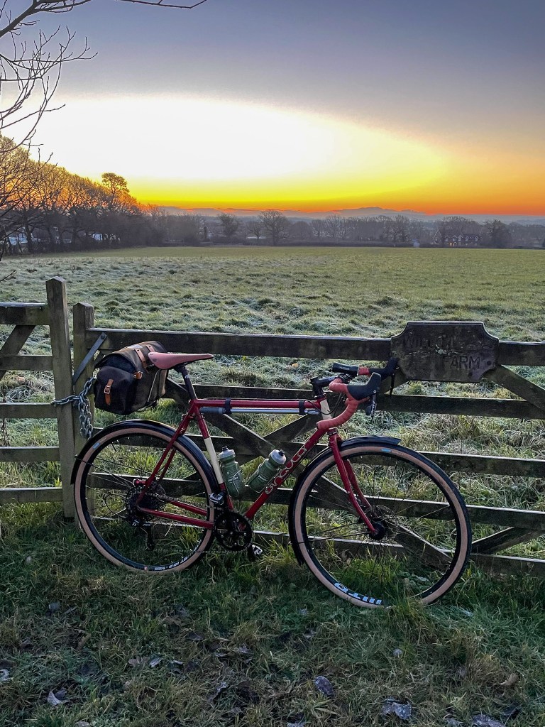 Cold – properly cold, no wind, no noise other than than the hum of the chain and the slight creak of cleat. Untreated roads covered in ice crystals, a solitary set of tyre tracks proving I’m not the only one to be stupid enough to come this way. Run off from the fields leaving great sheets of ice across the lane. Hop off and step onto the verge, don’t really want a fall. The grass doesn’t so much crunch under my feet as crack.